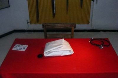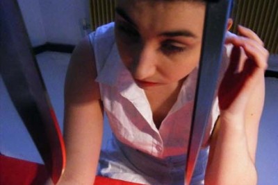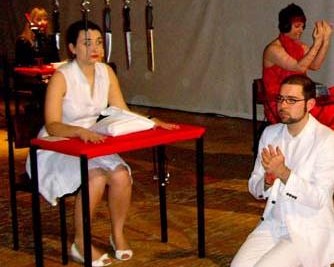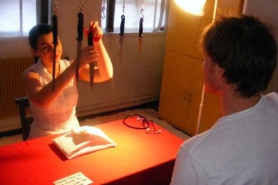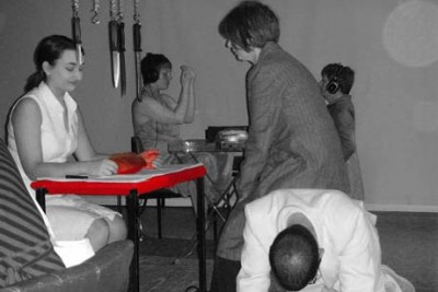 Whilst one performer, on all fours, offered himself as a living chair, another sat behind a series of knives that hung on chains from the ceiling. Through a silent exchange, the audience member was instructed to choose the knife that s/he would like to see used. On the table, a loaf of red coloured bread was carefully unwrapped. The performer then cut a slice in order to share it with the audience member.